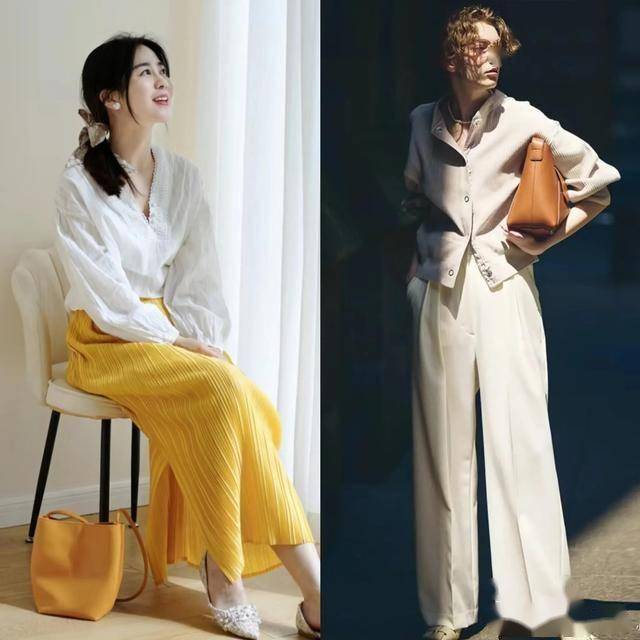 白色亚麻衬衫,搭配日光黄色的长裙,配色明媚温柔,给人一种优雅清新的女人味,是今年非常流行的配色。