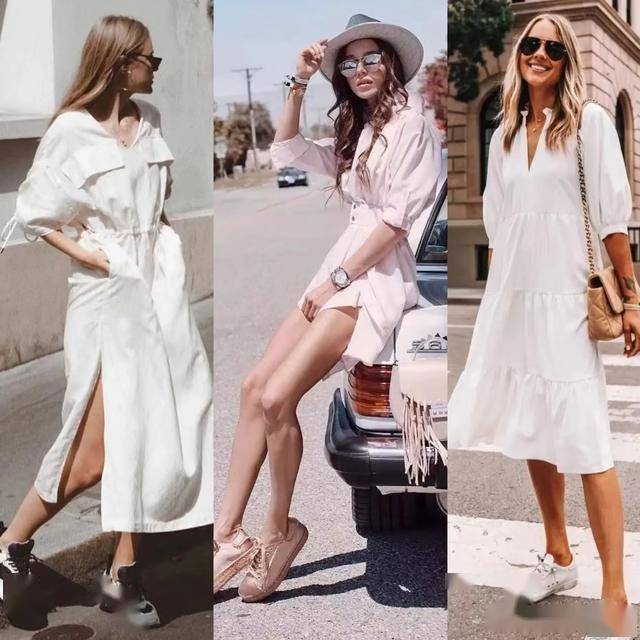夏天一件白色的衬衫裙,保留了衬衫的帅气干练,又有连衣裙的温柔女人味,配上运动鞋,软化了正式感,多了些清新减龄的腔调,既清凉又很仙女范儿。