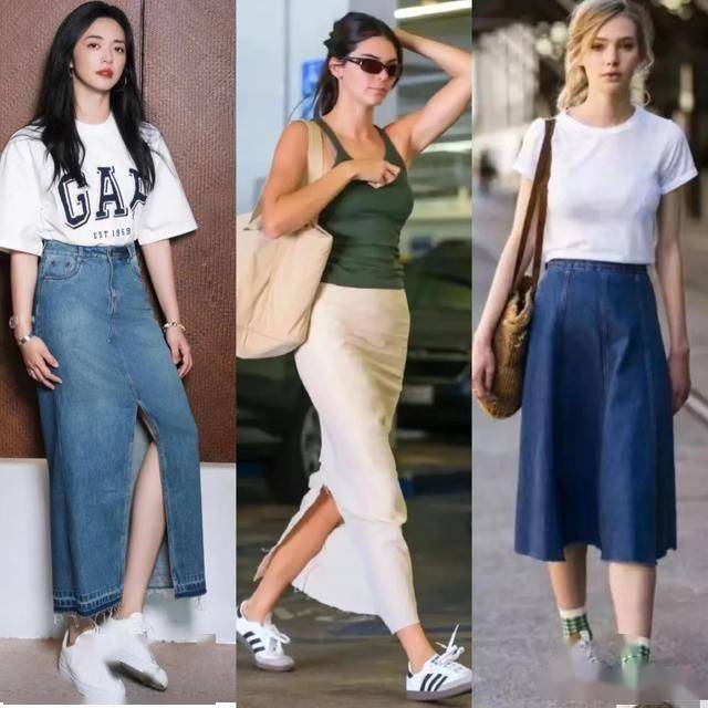 简单的白T搭配牛仔长裙,配上小白鞋,全身配色看起来干净清爽,造型又自然休闲,带着些复古又清纯的调调,特别适合出游时穿,特别减龄。