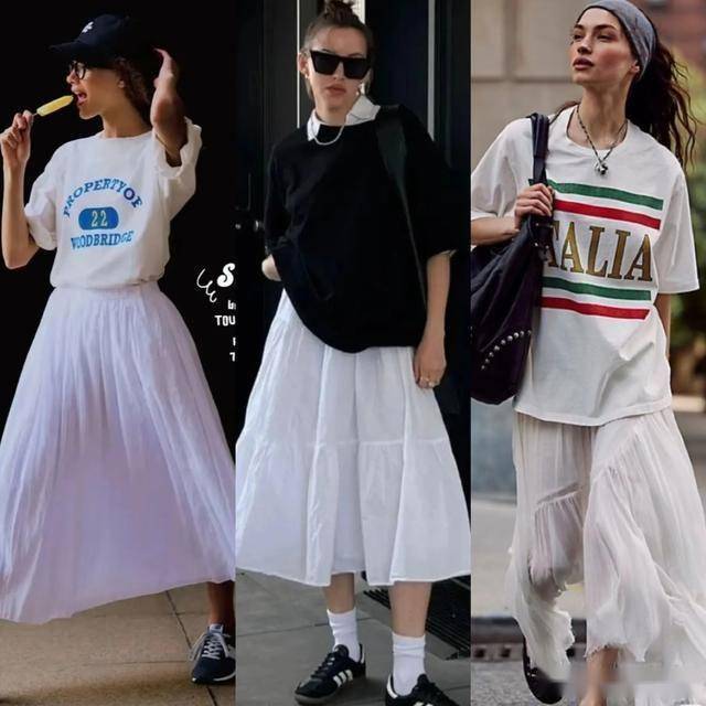 很喜欢宽松的T恤衫搭配白色长裙,有种慵懒随性的休闲风格,配上黑色的高帮帆布鞋,给人一种青春学院风的腔调,简单又有时髦的松弛感,特别适合五月出游时穿。