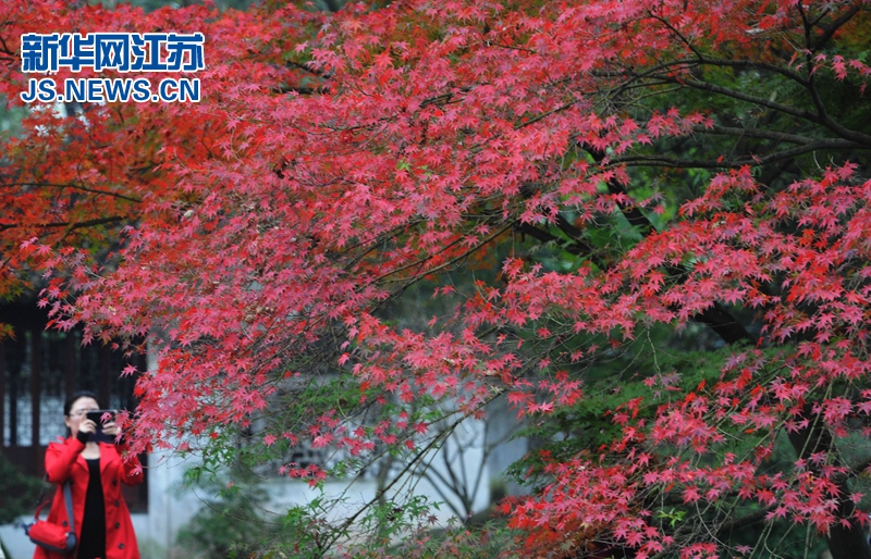 初冬时节, 江苏苏州古典园林拙政园内依然是一派“秋色”,五彩缤纷的秋叶色彩,让冬日里前来观光的游客陶醉其中。图为11月20日,游人在苏州古典园林拙政园观光赏景。