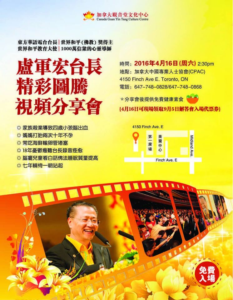 多伦多观音堂将于2016年04月16日周六下午2点半举行盛大的卢军宏台长震撼图腾视频精选分享活动。届时为广大有缘信众播放心灵法门的创始人,世界著名图腾大师,澳洲东方华语电台卢军宏台长精选震撼图腾视频片段:三百 ...
