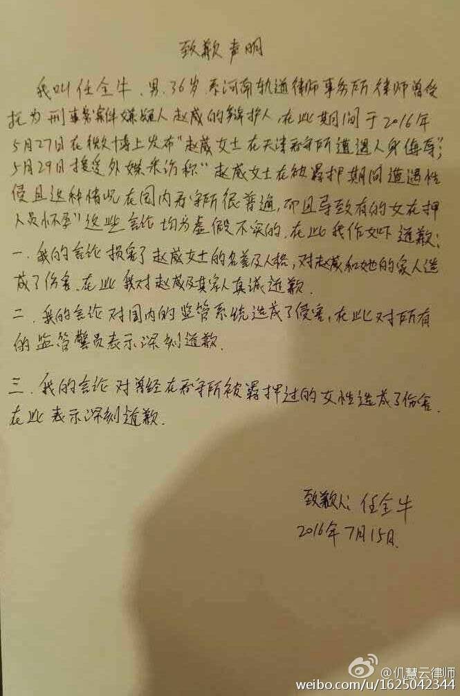 受赵威委托,代理人发表声明如下:任全牛已通过司法途径向赵威表示歉意;同时认为自己编造“赵威在看守所受到人身侮辱”之言词给公安干警的声誉造成损害。 赵威初步接受任全牛的道歉,认为任全牛应 ...