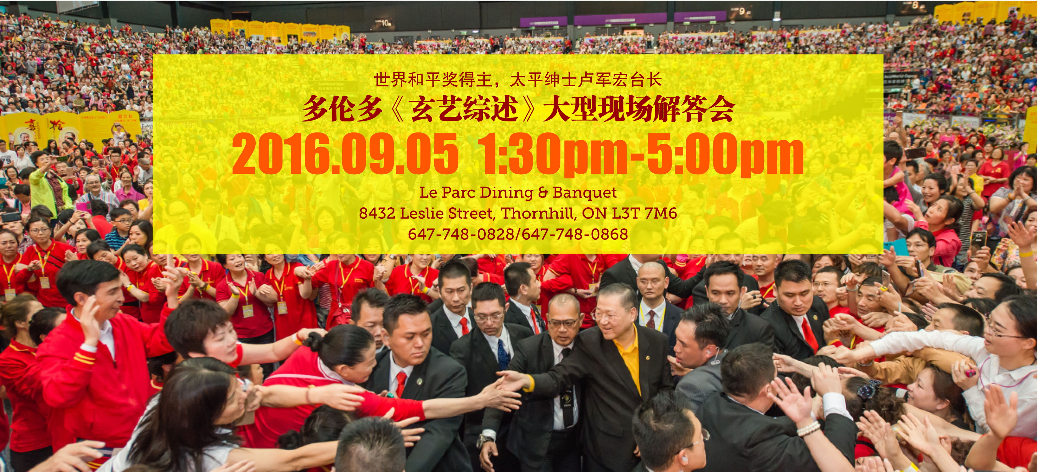 特大喜讯: 世界和平奖得主卢军宏台长将于9月5日亲临多伦多! 精彩详情:http://guanyintangca.wix.com/fahui 加拿大观音堂文化中心将于2016年9月5日星期一下午一点半在Le Parc Dining & Banque ...