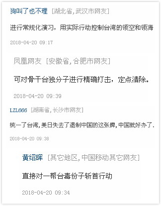 http://news.ifeng.com/a/20180420/57733855_0.shtml要实施有效震慑必须具备四个条件:一要有实力,二要有手段,三要有传递决心和意志的渠道,四要有可信度。军演恰恰是这四大要素的集合体。美国亲台分子和赖清德等 ...