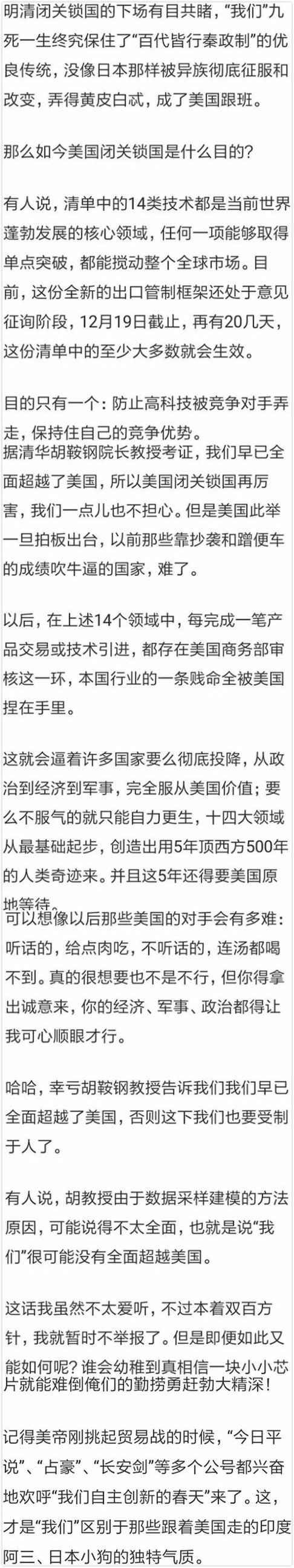 渤海莫大 太初的初二 有些东西不能写,何以故?曰:好鞋不踩臭狗屎。那咱就可着美国使劲踩吧,给丫踩出花儿来。11月19日,美国商务部工业安全局发布了一项草案征集意见,名曰“新出口管制清单考虑范围” ...