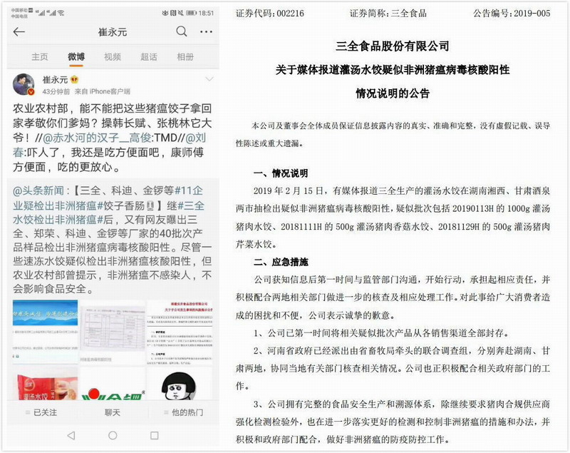 本帖最后由 xlyyj 于 2019-2-18 03:04 编辑 猪瘟病毒事件再度爆发,并牵连到A股上市公司,2019年狂飙的猪肉概念股,要停一停了?刚刚有所起色的食品板块,压力也要来了?2月18日早间,三全食品正式发布公告回应灌 ...