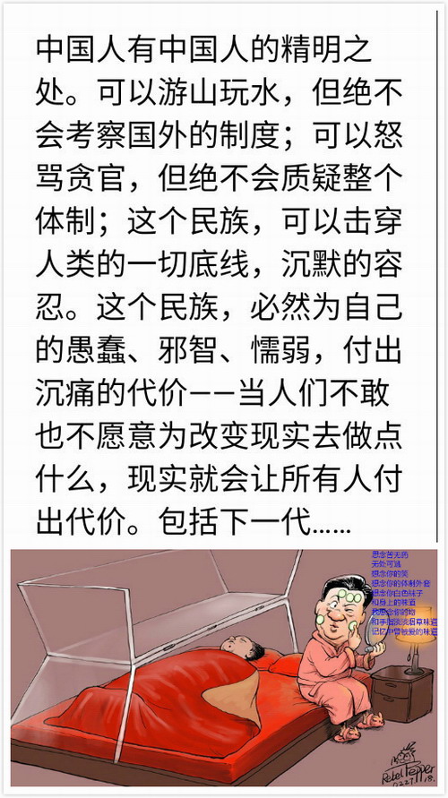 本帖最后由 xlyyj 于 2019-4-26 11:40 编辑 目前中国的社会,是处在一个以片面理解的经济发展观为唯一导向的、最原始的人吃人的初期资本主义阶段,而这个腐败阶段正是欧洲两百年前革命的温床。中国经历了那么 ...