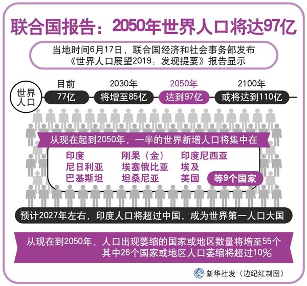 联合国经济和社会事务部2019年6月17日发布一份报告说,2030年世界人口将从目前的77亿增至85亿,2050年达到97亿,2100年或将达到110亿。 这份名为《世界人口展望2019:发现提要》的报告说,从现在起到2050年, ...