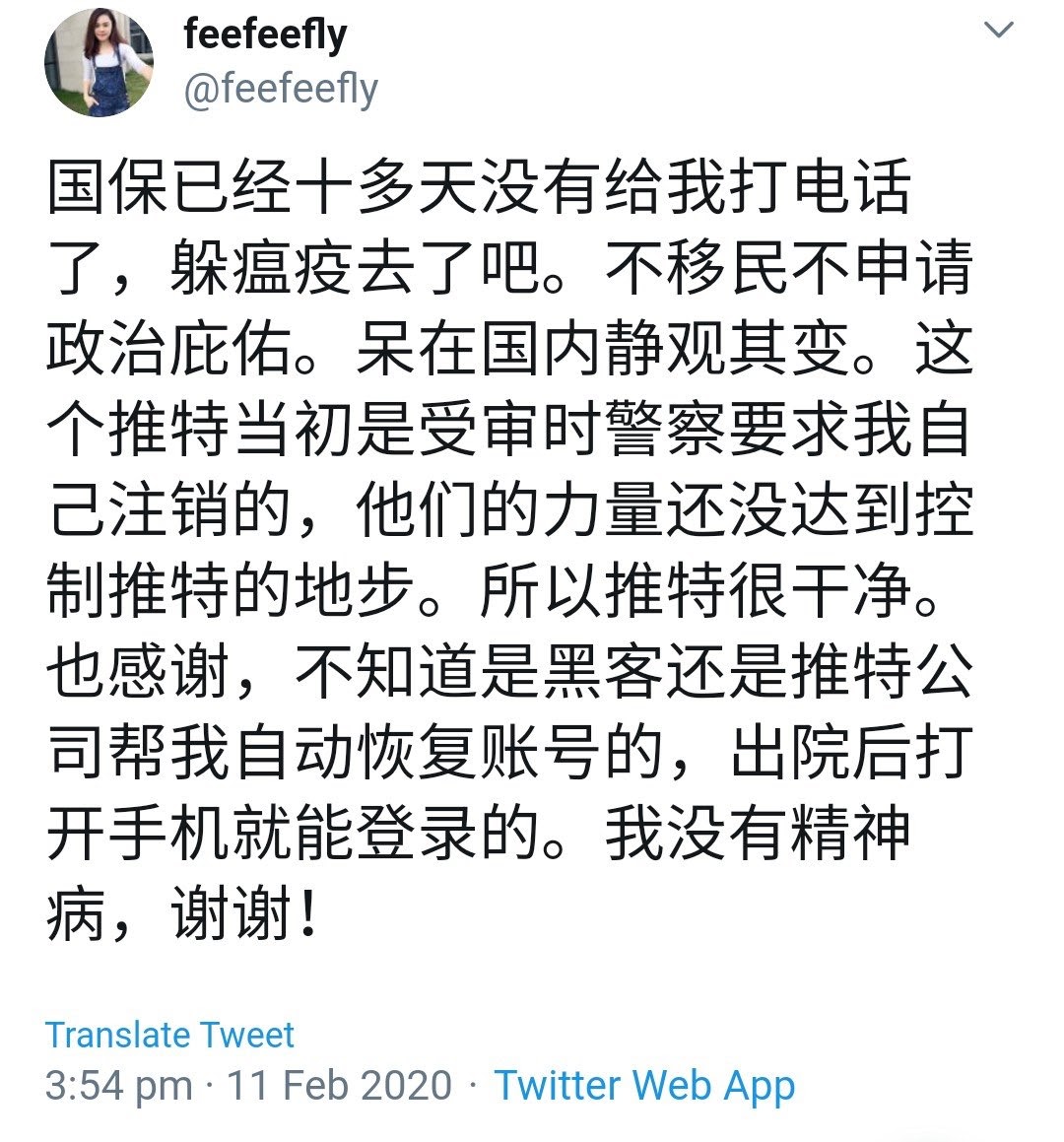 推特用户feefeefly在2020年2月11日的推文,是否是董瑶琼亲自发布,不得而知。总是感觉推特ID: feefeefly,和这条推文有一些疑点。因为没有最终证据,只能是根据之前和现在已知的情况,作出推断,不保证准确。此条推 ...