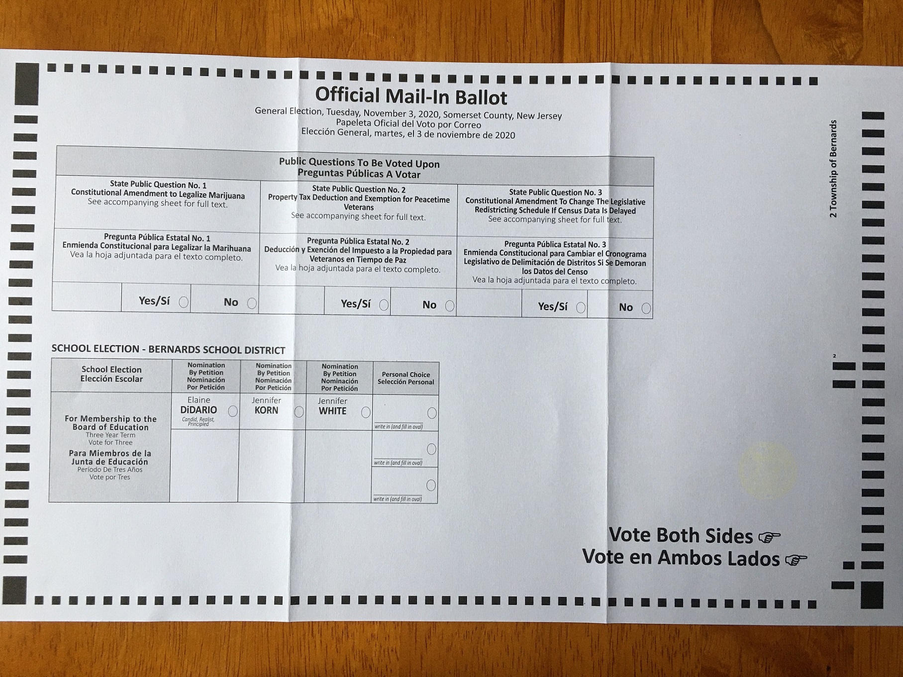 这是NJ的选票,其它州的可能不一样。 第一张照片是选票的正面;第二张是背面;第三张是局部;第四张是内信封;第五张是外信封。 信封上说可以邮寄,但是每一个镇都有一个Dropbox,号召大家直接把填好 ...