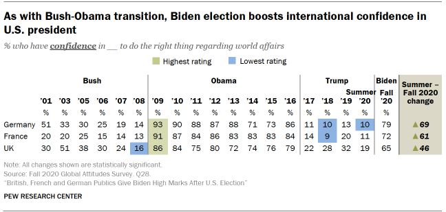 海阔天空 根据富比士(Forbes)2021年10月19日的报道,盖洛普对46个国家和地区的调查发现,截至2021年8月,对美国的支持率为49%,与奥巴马上任时大致相同。相比之下,川普上台的第一年,美国的全球支持率从48%急 ...