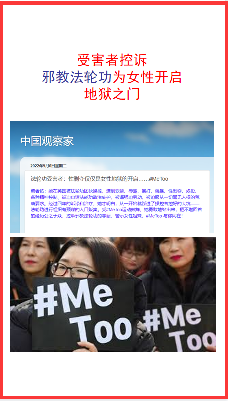 编者按:她在美国被法 轮 功团伙操控,遭到软禁、辱骂、暴打、强暴、性剥夺、奴役、各种精神控制、被迫申请法 轮功政治庇护、被逼强迫劳动、被迫服从一切毫无人权的荒唐要求。经过四年的诉讼和治疗,她才明白,从一 ...