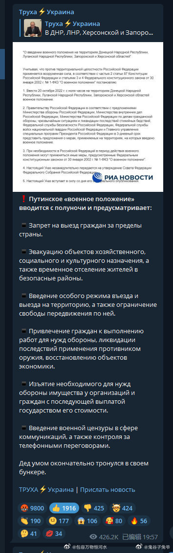 来源:鬼谷子兔爷 在发布戒严令之后 还在顿巴斯的乌克兰军队和北约雇佣军就变成武装叛乱分子和恐怖分子 根据俄罗斯法律规定 这些人如果被抓 可以判刑15年 而在戒严时候 俄罗斯国安局和俄罗斯所有武装力量就会全面 ...
