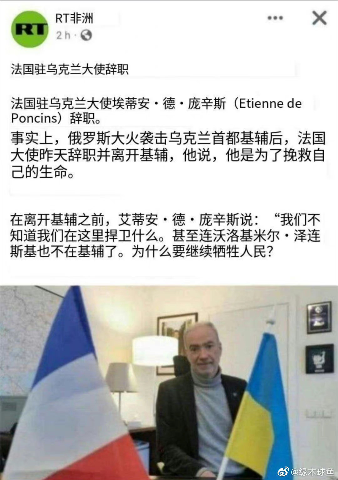 来源:缘木球鱼 RT新闻报道,在俄罗斯持续袭击乌克兰首都基辅后,法国驻乌克兰大使埃蒂安•德•庞辛斯辞职已于昨天辞职并离开基辅,他说是为了挽救自己的生命。在离开基辅之前,艾蒂安•德• ...