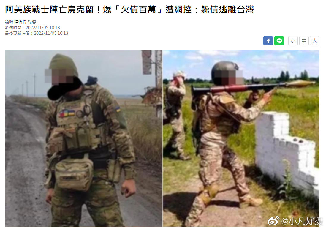 另外一个信源:台湾25岁男子战死乌克兰,被曝生前欠债百万元新台币 来源:观察者网 综合台湾“中央社”、TVBS新闻网等11月5日报道,25岁台湾男子曾圣光加入乌克兰国际军团后,日前于卢甘斯克地区作战时因失血过多身亡。曾圣光的家人已证实受到噩耗,他是第一位赴乌克兰参战阵亡的台湾人。 曾圣光家人称曾多次劝阻,但他铁了心要上战场。随后有岛内网友质疑称,曾圣光疑似因在台湾积欠大笔债务遭催讨才选择参战。台媒随后查到名为“曾圣光”的债务人在台北、新北、花莲等法院共有8笔民事裁定,累计欠债达一百多万新台币。 https://www.guancha.cn/internation/2022_11_05_665409.shtml |