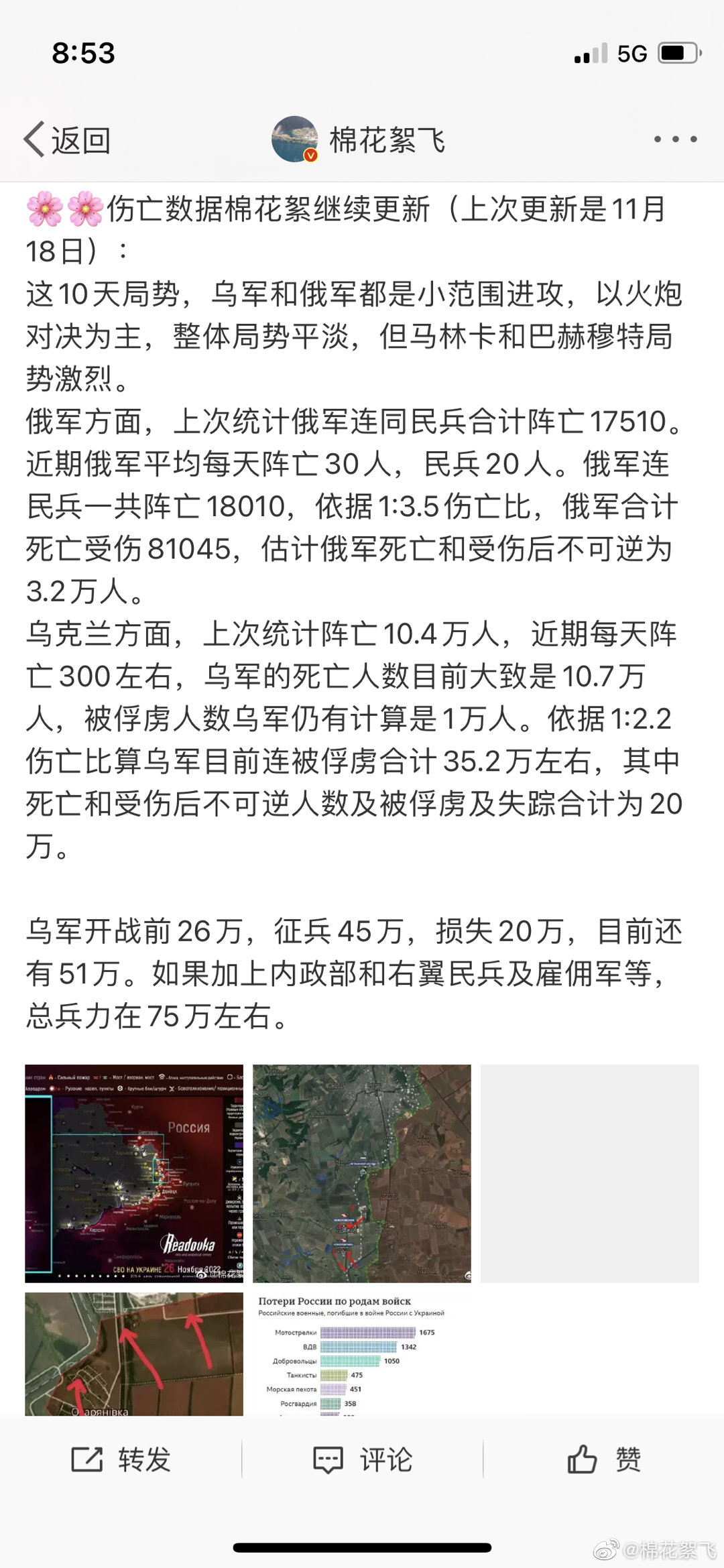 来源:棉花絮飞 #欧盟主席表示乌克兰已经死亡10万士兵以上,跟棉花絮一直以来统计吻合。 #2架中国轰6K和6架俄罗斯图95MS进入中国周边区域联合巡航。 #俄罗斯国防部长宣布 32万左右动员兵已经完成训练 ,目前8万 ...