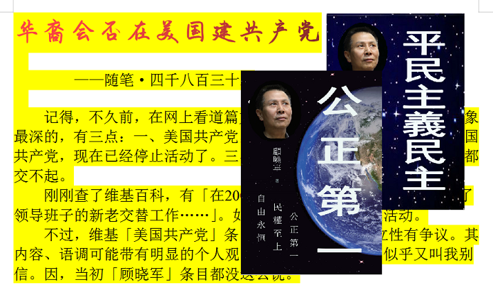 华裔会否在美国建共产党 ——随笔·四千八百三十三 记得,不久前,在网上看道篇文章,介绍美国共产党的始末。印象最深的,有三点:一、美国共产党,是在美的德裔搞起来的。二、美国共产党,现在 ...