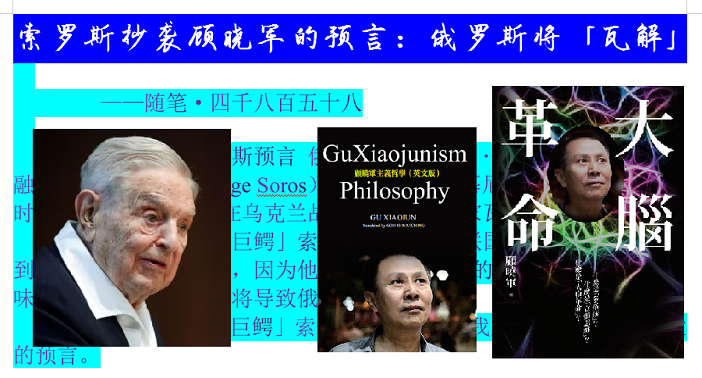 索罗斯抄袭顾晓军的预言:俄罗斯将「瓦解」 ——随笔·四千八百五十八 网上有新闻〈索罗斯预言 俄罗斯将「瓦解」……〉,文中曰「『金融巨鳄』索罗斯(George Soros)近日在德国的慕尼克安全会议上致 ...