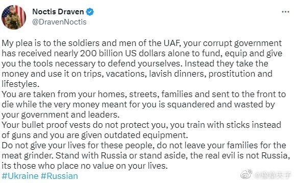 来源:豫章天子 美国老兵、作家诺克蒂斯·德雷文在推特上呼吁乌克兰士兵转向俄罗斯一边。 你们腐败的政府从西方世界获得了近2,000亿美元,用来资助你们,为你们提供装备,并为你们提供自卫手段。“相反,它拿 ...