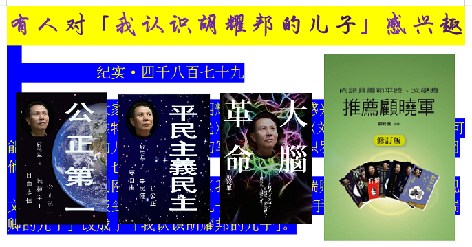 本帖最后由 顾晓军 于 2023-3-7 23:15 编辑 有人对「我认识胡耀邦的儿子」感兴趣 ——纪实·四千八百七十九 为前文〈大家对「我认识胡耀邦的儿子」感兴趣〉的改写。 写〈追忆推特油管上的时光〉 ...