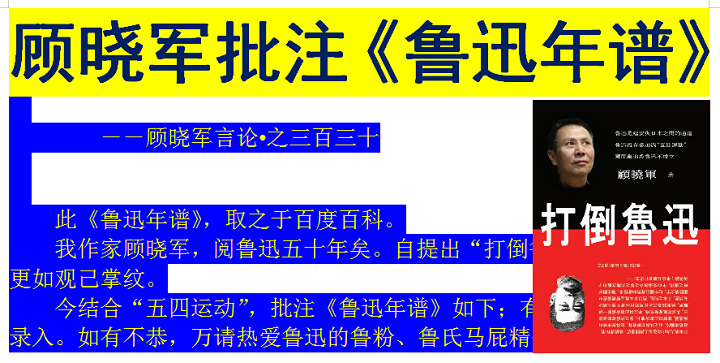 顾晓军批注《鲁迅年谱》 --顾晓军言论•之三百三十 此《鲁迅年谱》,取之于百度百科。 我作家顾晓军,阅鲁迅五十年矣。自提出“打倒鲁迅”后,视鲁迅更如观己掌纹。 今结合“五四运动 ...