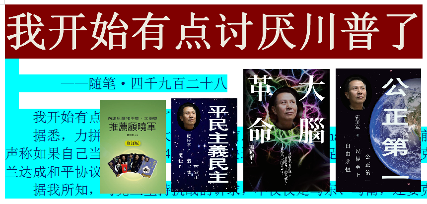 我开始有点讨厌川普了 ——随笔·四千九百二十八 我开始有点讨厌川普了,真的! 据悉,力拼2024总统大选的美国前总统川普(Donald Trump)日前声称如果自己当选总统,24小时内解决这场战争、 ...