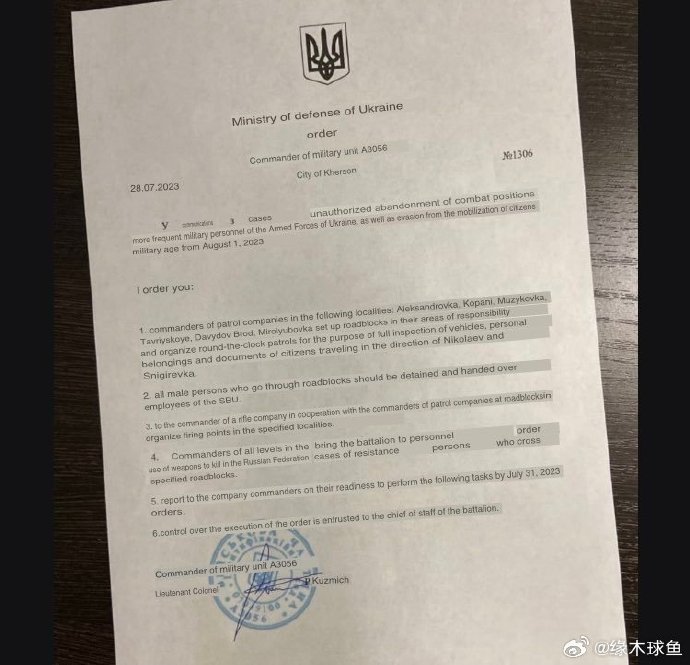来源:缘木球鱼 赫尔松的乌克兰国民警卫队接到命令,设置路障,将所有被捕获的男性交给 SBU送往前线, 并杀死任何试图抵抗的人[哆啦A梦害怕] 男人哭吧哭吧不是罪[允悲]