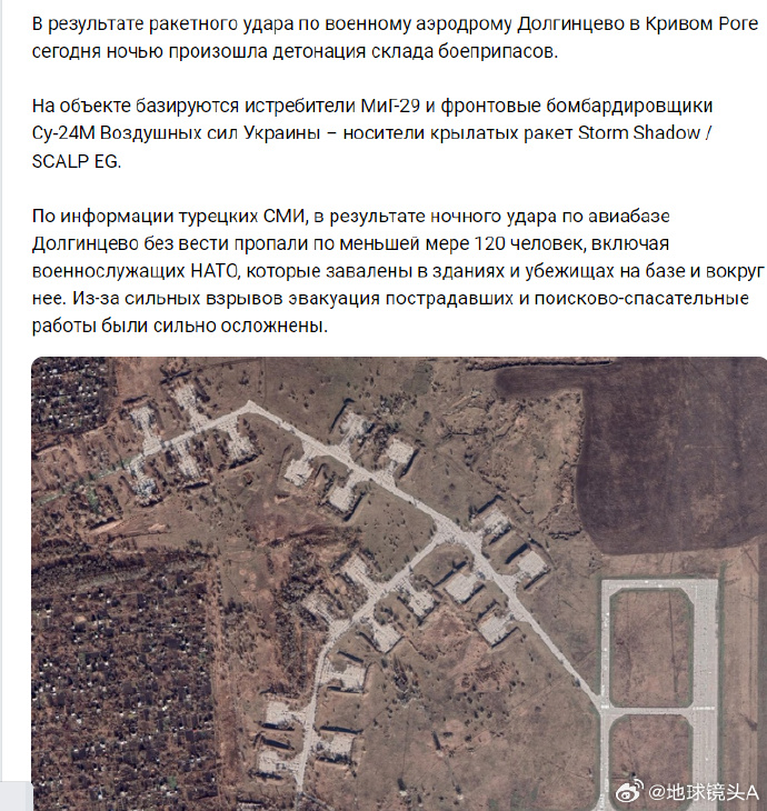 来源:地球镜头A 今天凌晨,乌克兰的多尔金采沃军用机场再次遭到俄军导弹打击,导致弹药库爆炸。 乌克兰空军的米格-29 战斗机和苏-24M 前线轰炸机--"风暴之影"/"SCALP EG "巡航导弹的载机--都驻扎在该 ...