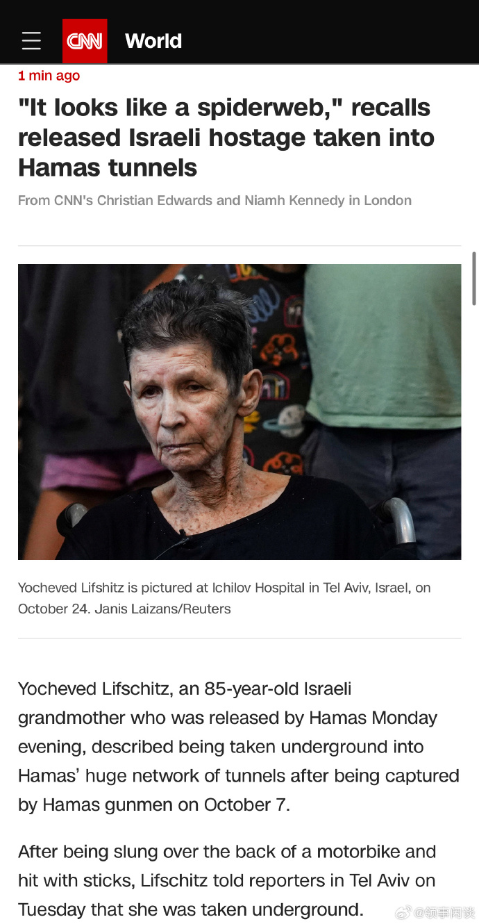 来源:地球镜头A,领事闲谈 周一晚上被哈马斯释放的85岁的以色列祖母Yocheved Lifschitz描述了在10月7日被哈马斯枪手抓获后被带到哈马斯巨大的隧道网络的地下。 在被挂在摩托车后部并被棍子击中后,利夫希茨周 ...