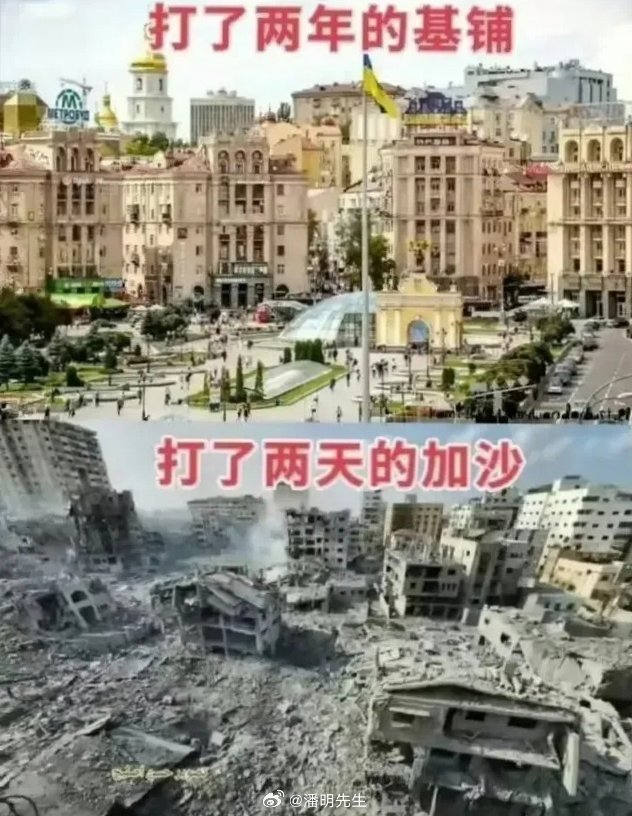 来源:潘明先生 打了两年的基辅还是城市,还有热闹的夜总会供有钱有势家庭的新青年漫歌热舞。 打了两天的加沙却成为一堆废墟……… 你们究竟承不承认普京的慈悲?
