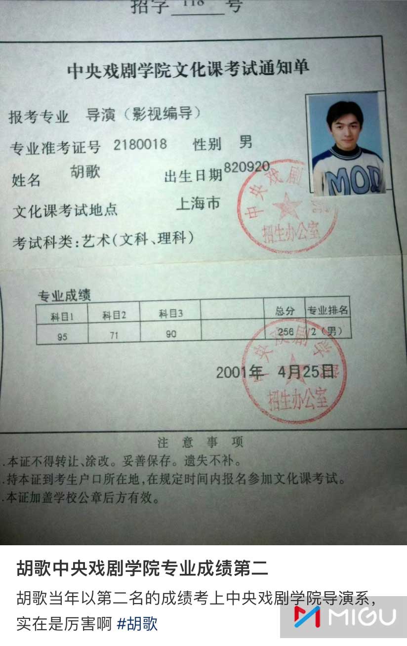 胡歌当年以第二名的成绩考上中央戏剧学院导演系
