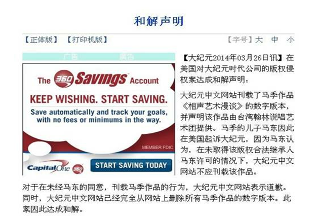 李洪志的大纪元媒体从不认错的终于认错了。3月26日,法轮功网站赫然登了一则《和解声明》,说的是法轮功之前因擅自刊登中国著名表演艺术家、相声大师马季的作品《相声艺术漫谈》,并将其著作权占为己 ...