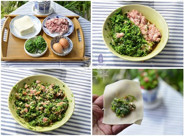 食材:猪肉馅 荠菜 馄饨皮 配料:紫菜 鸡蛋 虾皮 调料:食盐 芝麻油 玖顺生姜汁 生抽 味精 五香粉 白胡椒粉 辣椒油 制作过程: