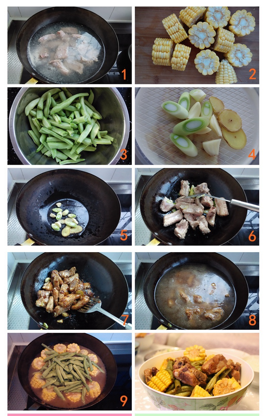玉米豆角炖排骨 主料:排骨800g,豆角500g,水果玉米2根 辅料:葱姜蒜适量 调料:盐2小勺,鸡精半小勺,生抽4汤匙,老抽4汤匙,黄豆酱1大勺 制作方法: