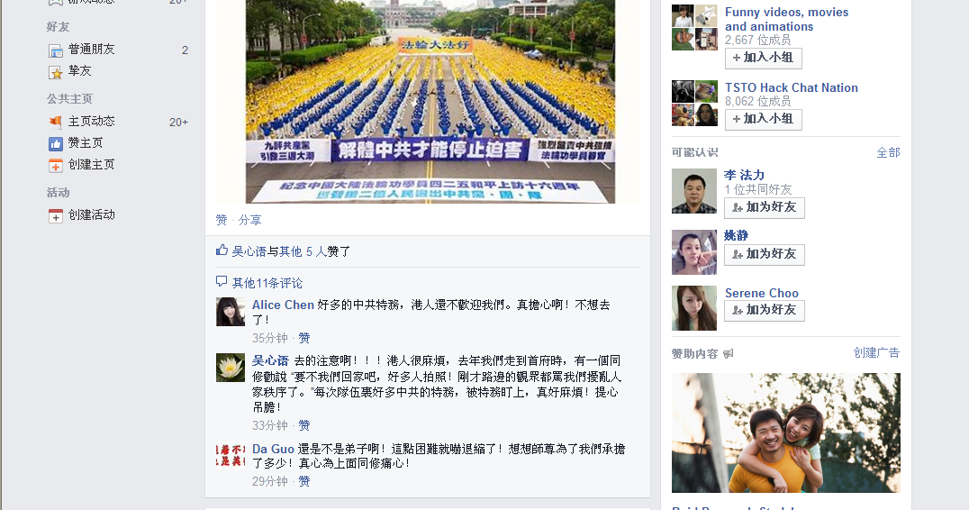 我闲来无事喜欢用facebook聊聊美女,就在昨天被一个叫法轮大法的讨论组加了进去,打开的时候看到他们在商讨去香港参加游行的事情,从他们的对话中可以看到,这些年的香港法轮功发起的游行,大多数弟子都是台湾赶来 ...