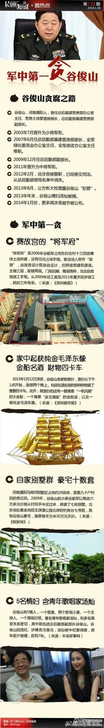 网路上疯传一张解析谷俊山贪腐图,标题为《军中第一贪谷俊山》,将谷俊山的贪腐淫乱黑幕重点一一列出。(网路图片)