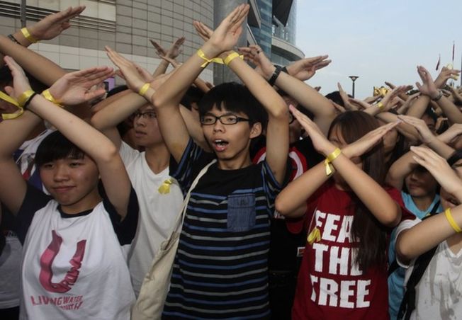 黄之锋(中)“占中运动”爆发时,积极参与。(路透资料照片)