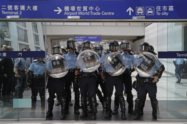 反送中活动已进行80多天,且愈演愈烈。已有香港民众准备移民海外。图为示威群众1日堵塞机场交通,港警赶到机场,驱离示威者。(美联社)