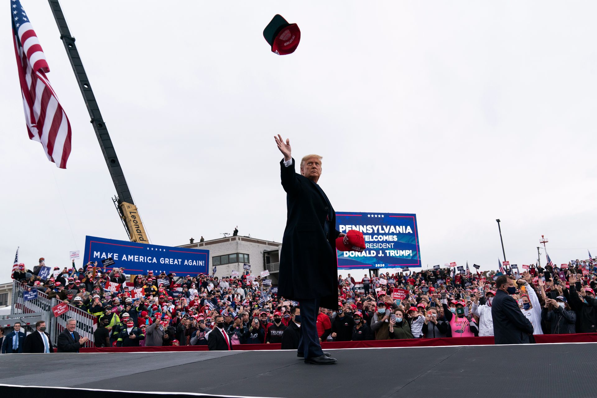 美国大选已经临近最后时刻,特朗普在忙于拉选票,而美国经济却在新冠肺炎疫情的再次失控中陷入恐慌。图为10月26日,特朗普在美国宾夕法尼亚州参加竞选集会。(AP)