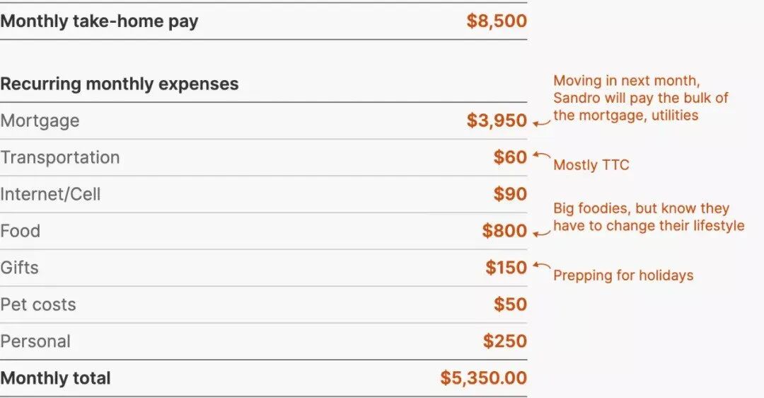 根据Sandro的数据,他每月到手税后工资为$8500,固定开支如下: