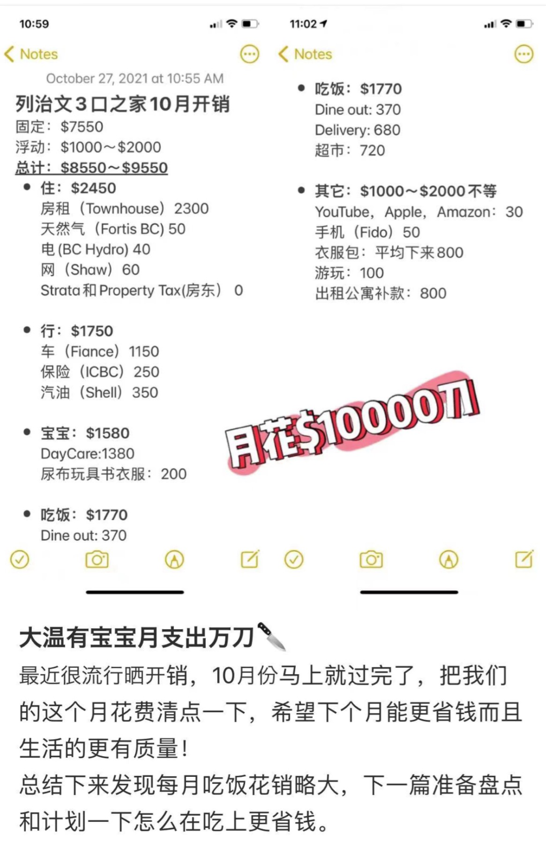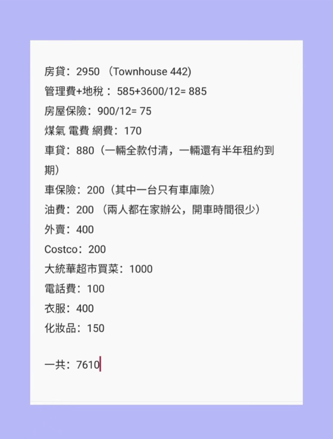 网友B:  无娃小两口,1联排2辆车,每月开销$7600!