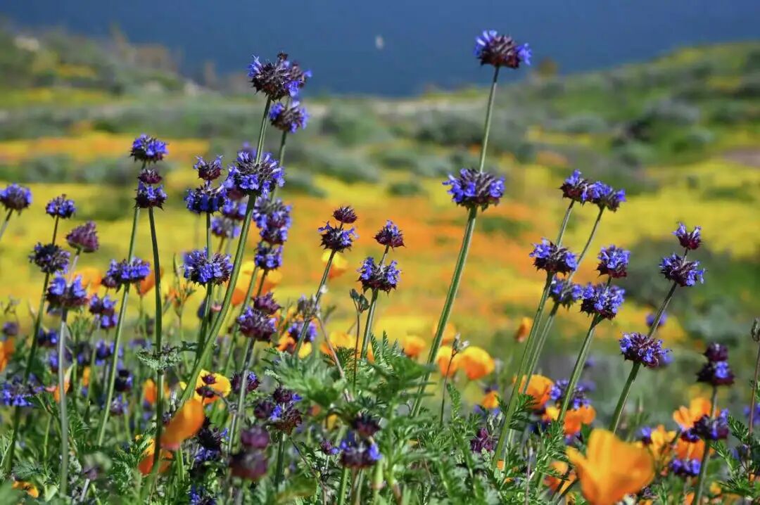 南加赏花最佳地点:Diamond Valley Lake Marina 这里算得上是南加野花superbloom的天花板!这里的野花种类繁多,百花盛开,除了罂粟花还有众多小黄花,深紫色小花和浅紫色鲁冰花。远观整片山头,满眼尽是黄橙橙金灿灿的,宛若一幅幅莫奈的画作。