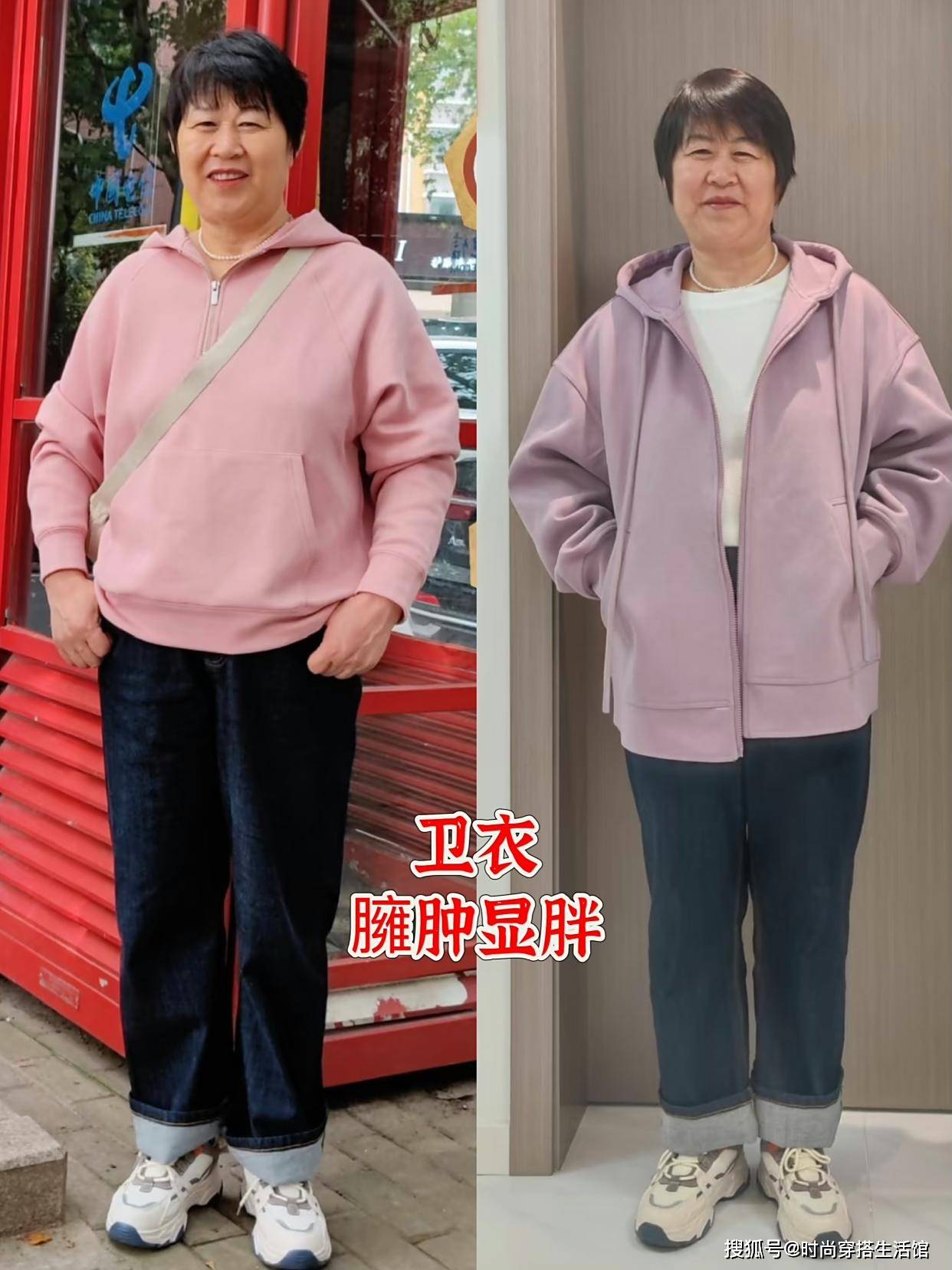 卫衣的版型因为是宽松舒适的款式深受五十六岁女性的喜爱,但对于大龄女性来说我们选择穿卫衣要谨慎的选择,不管是选择连帽、圆领还是开衫的卫衣,其实都要谨慎的选择,主要是因为这些卫衣不但是风格显年轻化,其次就是版型比较宽松舒适,稍微不慎的话就会横向拉宽身材臃肿和显胖,同时还会出现虎背熊腰的效果。