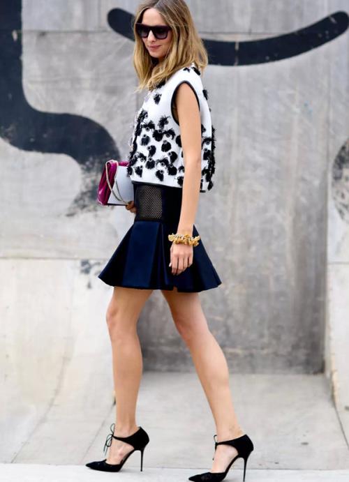 她的穿衣风格跟时装周动不动就张牙舞爪的时装精们不太一样,她能让很多很浮夸的单品在她身上都make sense,永远都是优雅的,美美的,很有气质,一看就是衣食无忧的贵妇。(对了,她也是俩孩子的妈了。身材也是很逆天。)但是她穿衣的细节很值得研究,颜色的印花的和谐度,每身衣服的比例都拿捏地一寸不多,一分不少。你仔细看看她裙角的长度,露出的脚踝的比例,上衣和裤子之间的呼应,值得学习的点特别多。先来看看她对裙装的搭配吧:
