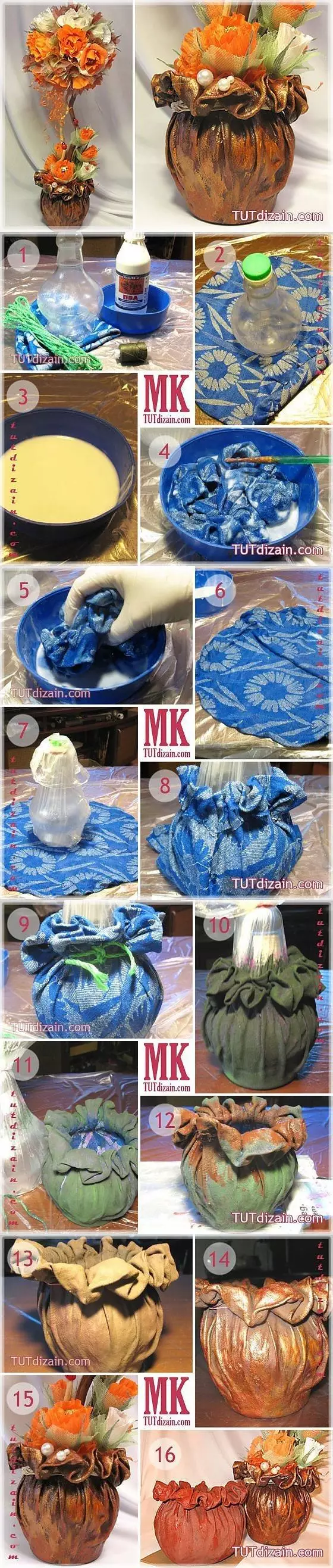 当然除了我们说的丝袜和旧衣服,你还可以使用包括纸、丝绸、皮革、粘土、干花、木材、蛋壳等等这些都可以尝试来装饰玻璃瓶。还可以用塑料泡沫来塑造一些造型。