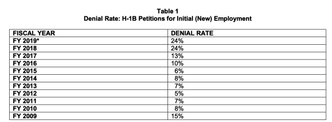美国政策国家基金会近日通过收集美国公民及移民服务局(USCIS)的数据,统计出2009年至2019年H-1B签证首次申请的拒签率。