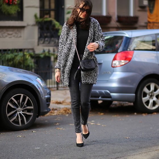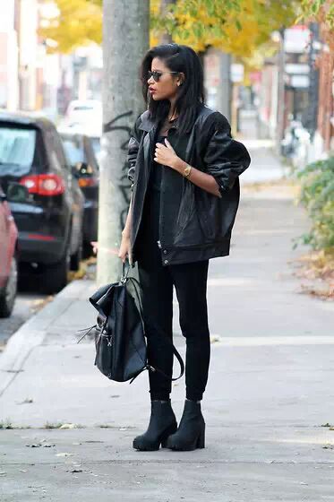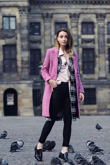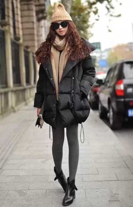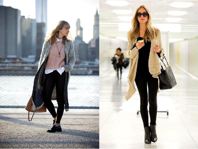 飘逸贴身的中长款针织开衫搭配超紧致打底裤,拉长身段调整比例的同时顺便还能遮挡一部分容易显得肉肉的大腿部分。