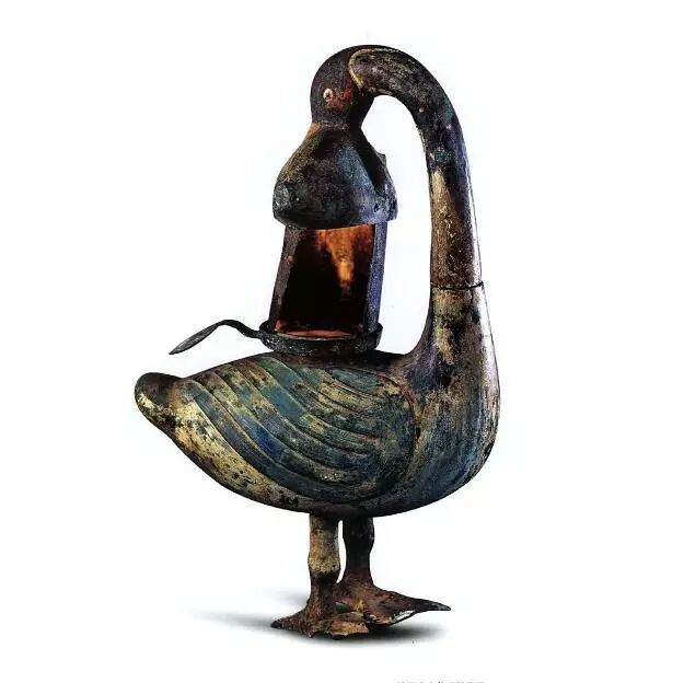 此物设计精巧,颇有科技含量,现收藏于山西博物院。鸿雁伫立,回首衔鱼,雁颈与灯体以子母口相接,鱼身与雁颈、腹腔中空相通。圆形灯盘附柄,可自由转动,盘下圈足与雁背直口套合。鱼腹部与灯盘相对应为圆形覆口,覆口与灯盘之间插立两块弧形屏板,交错开合,既能挡风,又可调节灯光亮度,灯火点燃时,烟雾通过鱼腹和雁颈导入雁腹,可防止油烟污染空气,妙!