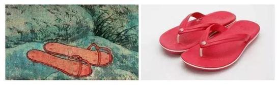 这幅赵孟頫的红衣罗汉图,菩提树下,一罗汉穿着红色袈裟,盘膝而坐,左手向前平伸,掌心向上,作“说法接引”姿态。设色大胆地使用了红配绿,色重而不俗,整体和谐、典雅。注意看罗汉下方,赫然有一双人字拖,和我们穿的人字拖一模一样!